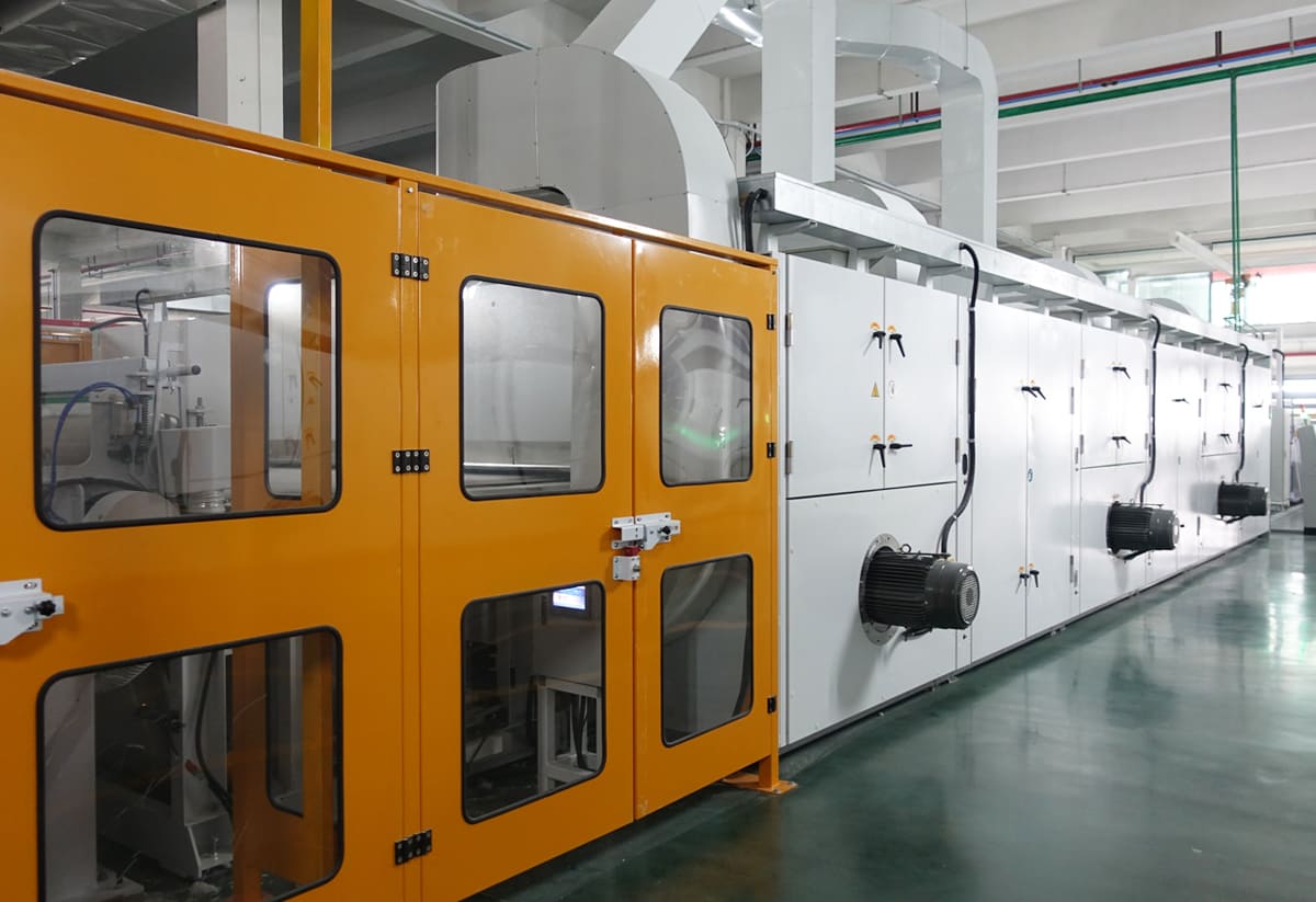 The processing fabric contains low melting-point composite fiber, after heating up to the melting-point by heat circulation air flowing through the fabric to melt dispersed fibers to form the fabrics. This process is by way of controlling hot air temperature, air volume, and reaction time to achieve the required physical characteristics.